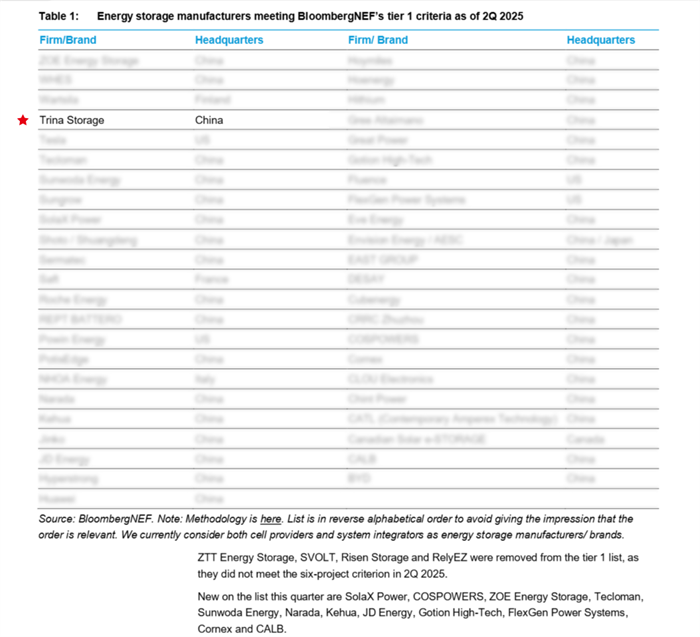 Trina Storage Earns Sixth Consecutive BloombergNEF Tier 1 Ranking in Q2 2025