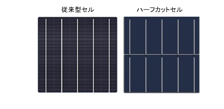「ハーフカットセル」は「ハーフセル」とも呼ばれます。従来のセルを半分にカットし、セルストリングスを分割し並列に接続する配線技術の採用により、発電ロスの低減やモジュール全体の発電効率の向上、発電量の増加などの効果が得られます。 こちらのページもご参照ください。