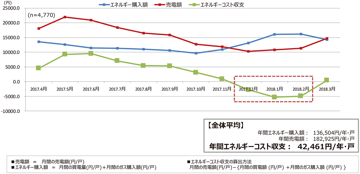 2017年4月から18年3月までの1年間の平均エネルギーコスト収支は、4万2461円/年・戸のプラスだった。収支がマイナスになったのは、12月~2月の3カ月のみ。前年の調査結果の平均3万3524円/年・戸に対し、収入は約27%向上した。