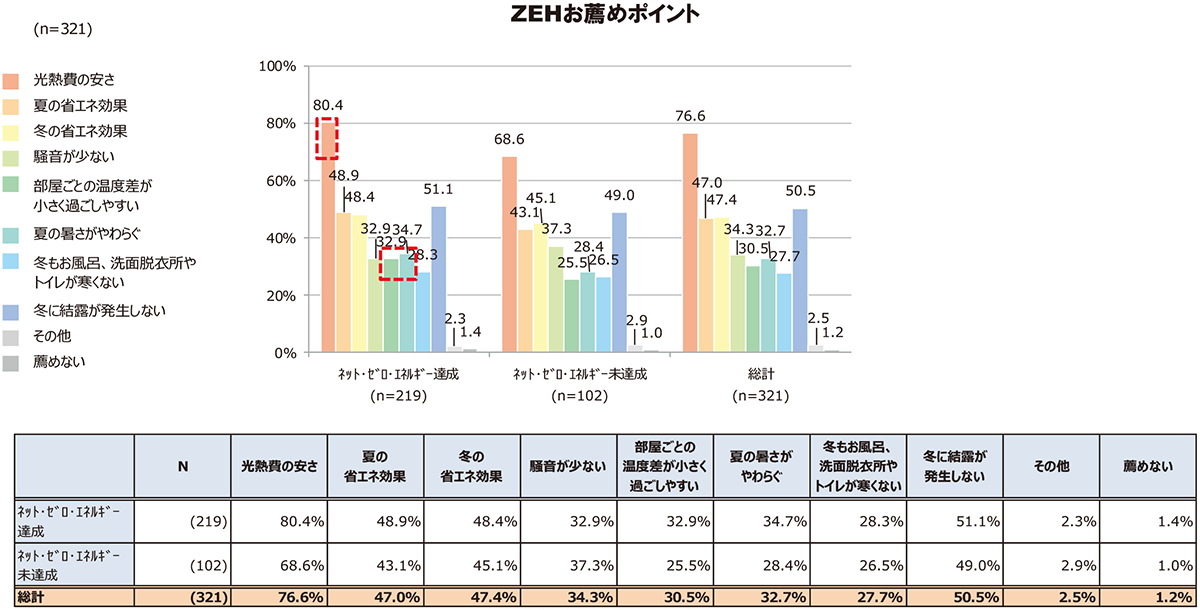 2014年度の事業者(N=321)に聞いた「ZEHお薦めポイント」では、「光熱費の安さ」が最も多い。ネット・ゼロ・エネルギーを達成したグループと、未達成のグループで比較すると、「光熱費の安さ」を推奨ポイントとする事業者は、達成したグループの方が10%以上高い。この他に、グループ間の差が大きかったのは、「部屋ごとの温度差が小さく過ごしやすい」「夏の暑さがやわらぐ」で、いずれも約7%の差があった。