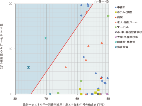 ZEB達成度の拡大図。設計1次エネルギー消費削減率(創エネ含まず、その他含まず)は50〜60%の間に多く分布しており、 創エネルギーによる削減率は0〜5%の間に多く分布している(資料:環境共創イニシアチブ)