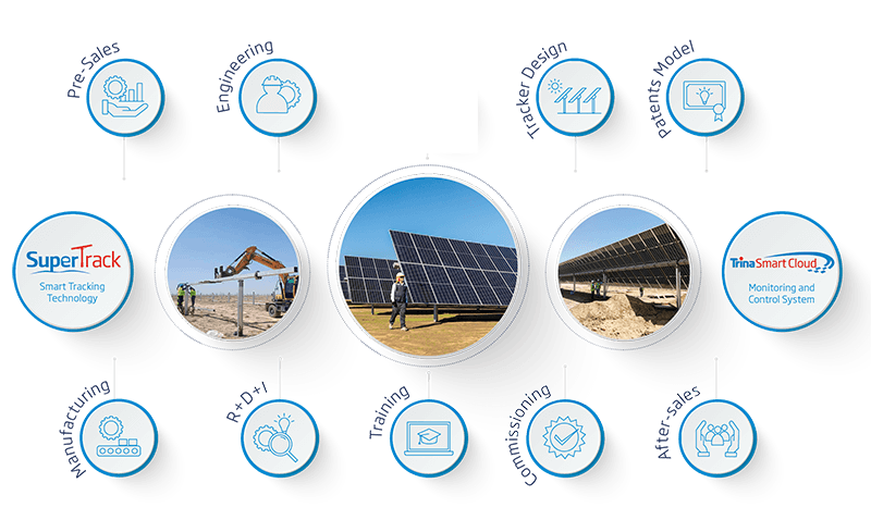 TrinaTracker está especializado en el diseño, fabricación, instalación y mantenimiento de basculantes fijos y seguidores solares. Con más de 5 GW desarrollados en todo el mundo, oficinas en los cinco continentes y más de 300 proyectos realizados, TrinaTracker es su socio de referencia para proyectos solares a gran escala. TrinaTracker ofrece a sus clientes un producto de óptima calidad con la tecnología más avanzada, logrando así un mejor desempeño en cada proyecto. Se adaptan a cualquier necesidad FV y brindan soluciones a la medida de sus clientes.