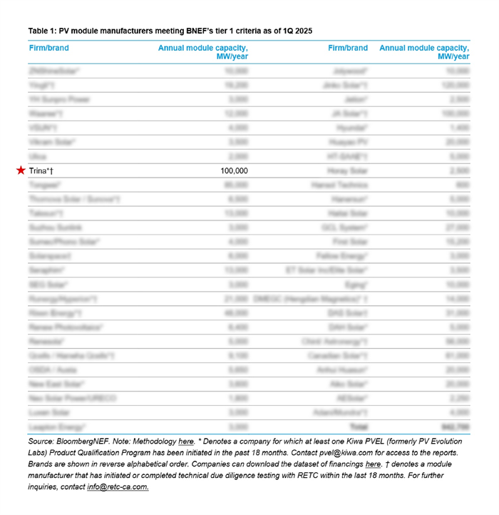 Trinasolar Again Recognized as Tier 1 PV Module Manufacturer by BNEF in Q1 2025